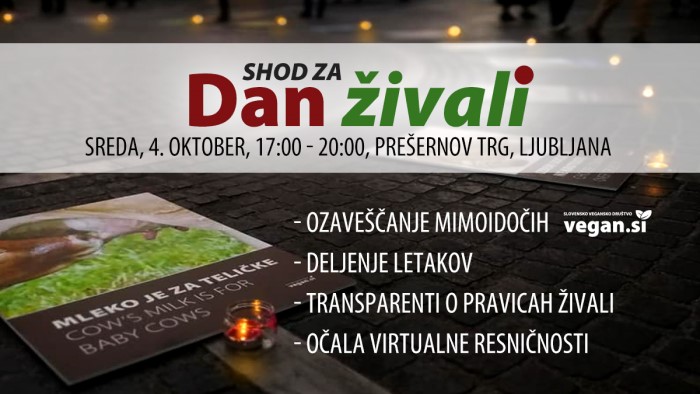 Ob svetovnem dnevu živali vas Slovensko vegansko društvo vabi na Prešernov trg, kjer bodo mimoidoče z letaki, slikami in transparenti seznanjali o pravicah živali.