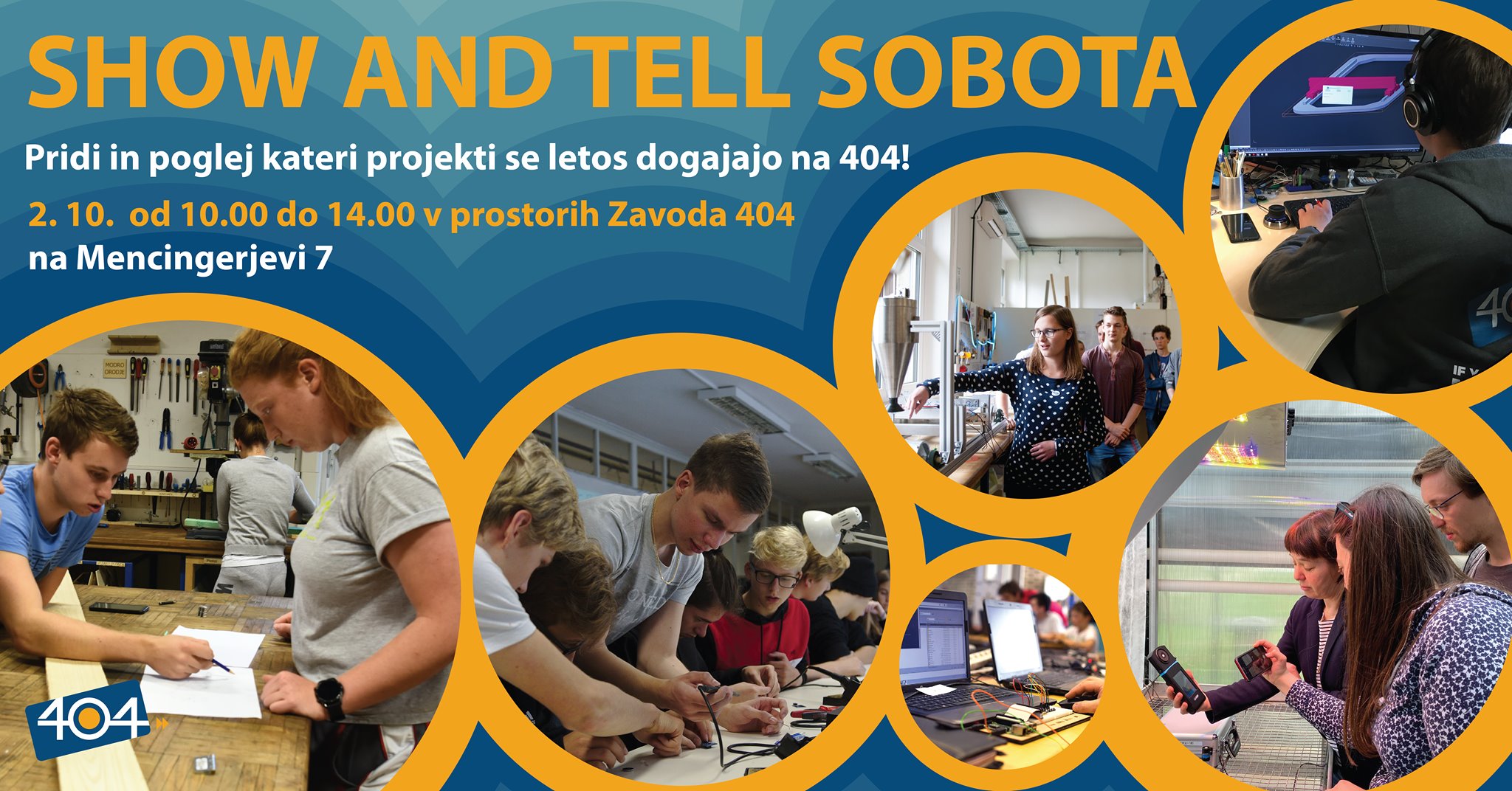 Namen dogodka je predstavitev projektov, ki so se v lanskem letu izvajali znotraj programov na zavodu 404 in možnost, da se jim pridružite na projektih, ki se bodo izvajali v prihodnje. Na dogodku bo tudi možno preizkusiti spajkanje in varjenje.