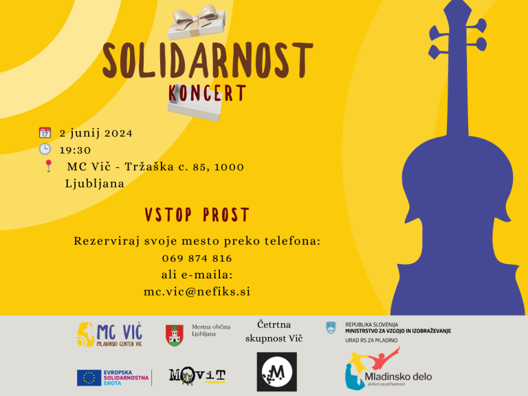 Mladinski center Vič bo 2. junija ob 19.30 gostil edinstven glasbeni dogodek, ki bo združil izjemne talente in na malce drugačen način praznoval svoj 5. rojstni dan. Pod naslovom “SOLIDARNOST” se bo odvijal koncert, ki bo hkrati praznik glasbe, praznovanja in solidarnosti.