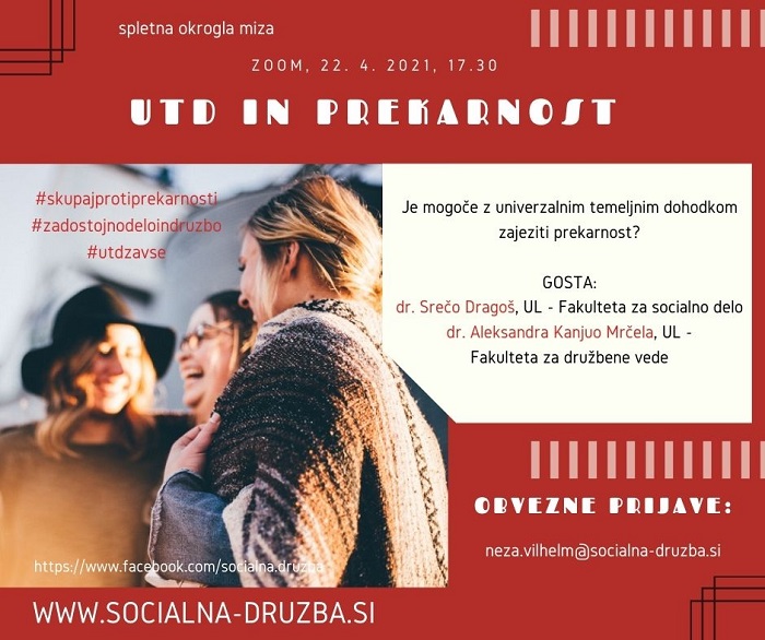 Gibanje za dostojno delo in socialno družbo vabi na okroglo mizo, kjer se bodo z gostoma, strokovnjakoma s področja univerzalnega temeljnega dohodka (Dragoš) in prekarnega dela ter prekarnosti (Kanjuo Mrčela) pogovarjali o možnostih zajezitve in daljnosežnega preprečevanja poglabljanja prekarnosti s pomočjo univerzalnega temeljnega dohodka (UTD).