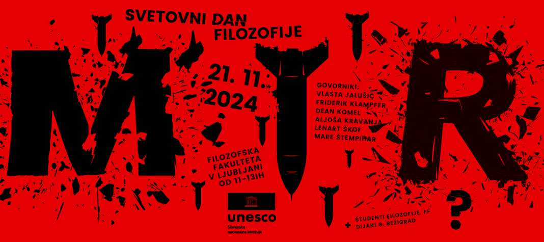 Filozofska fakulteta v Ljubljani vabi na osrednji dogodek ob letošnjem Svetovnem dnevu filozofije. Letos so za glavno temo slavnostnega srečanja izbrali temo miru.
