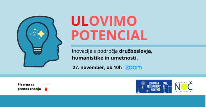 Pisarna za prenos znanja Univerze v Ljubljani vas v okviru Evropske noči raziskovalcev 2020 vabi na spletno predstavitev Inovacije s področij družboslovja, humanistike in umetnosti – ULovimo potencial!