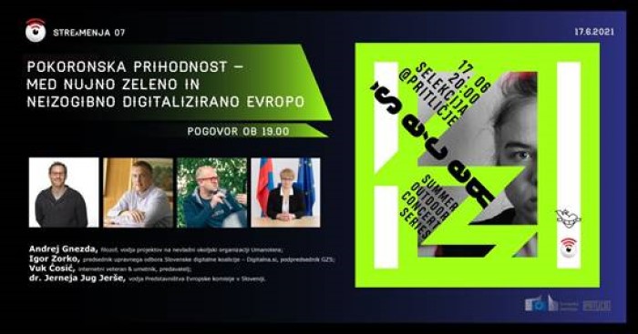 Predstavništvo Evropske komisije v Sloveniji in Pritličje vas vabita v četrtek, 17. 6. 2021, ob 19.00, pred Mestno hišo v Ljubljani, Mestni trg 1, na pogovor v živo in koncert “Stre(a)menja 07: Pokoronska prihodnost – med nujno zeleno in neizogibno digitalizirano Evropo”.