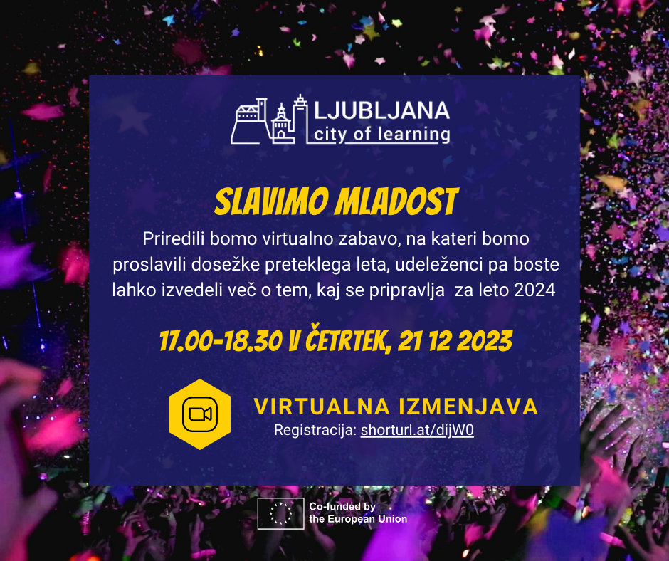Priredili bodo virtualno zabavo, na kateri se bo proslavilo dosežke preteklega leta, udeleženci_ke pa boste lahko izvedeli_e več o tem, kaj se pripravlja v okviru iniciative Ljubljana mesto učenja za leto 2024 in kako se lahko aktivno vključite.