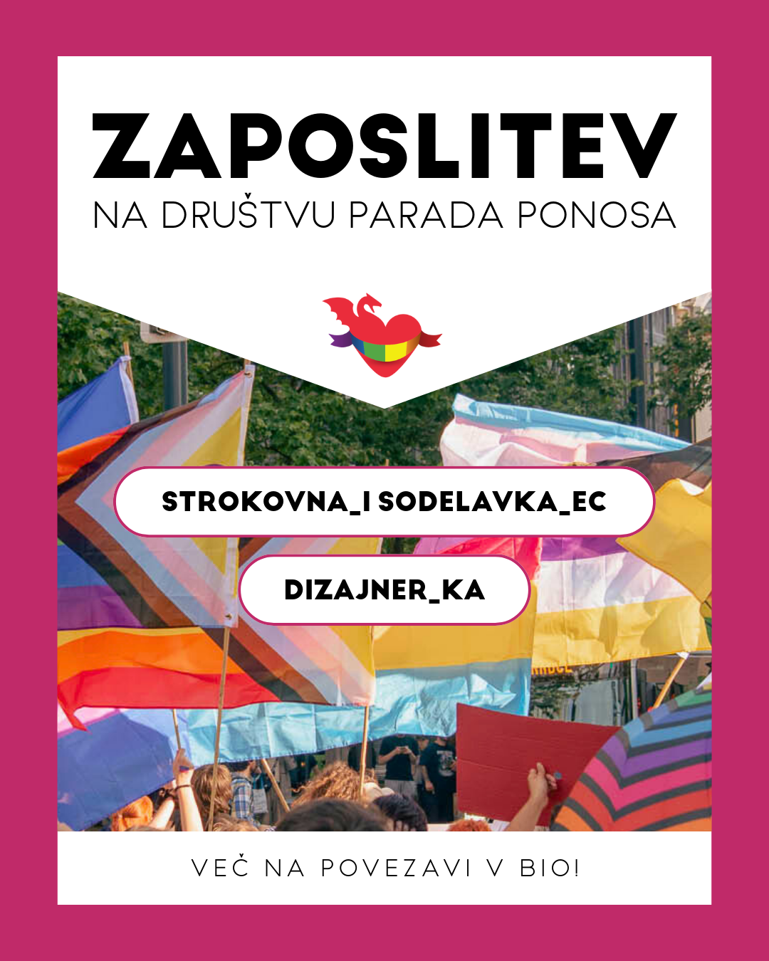Prvo razpisano delovno mesto je strokovna_i sodelavka_ec, ki skrbi za razvoj in izvedbo projektov, podporo LGBTIQ+ mladim ter vključuje delo na področju socialnega varstva.