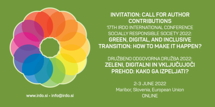2. in 3. junija 2022 bo virtualno potekala 17. IRDO mednarodna konferenca DRUŽBENO ODGOVORNA DRUŽBA 2022: Zeleni, digitalni in vključujoči prehod: kako ga izpeljati?.