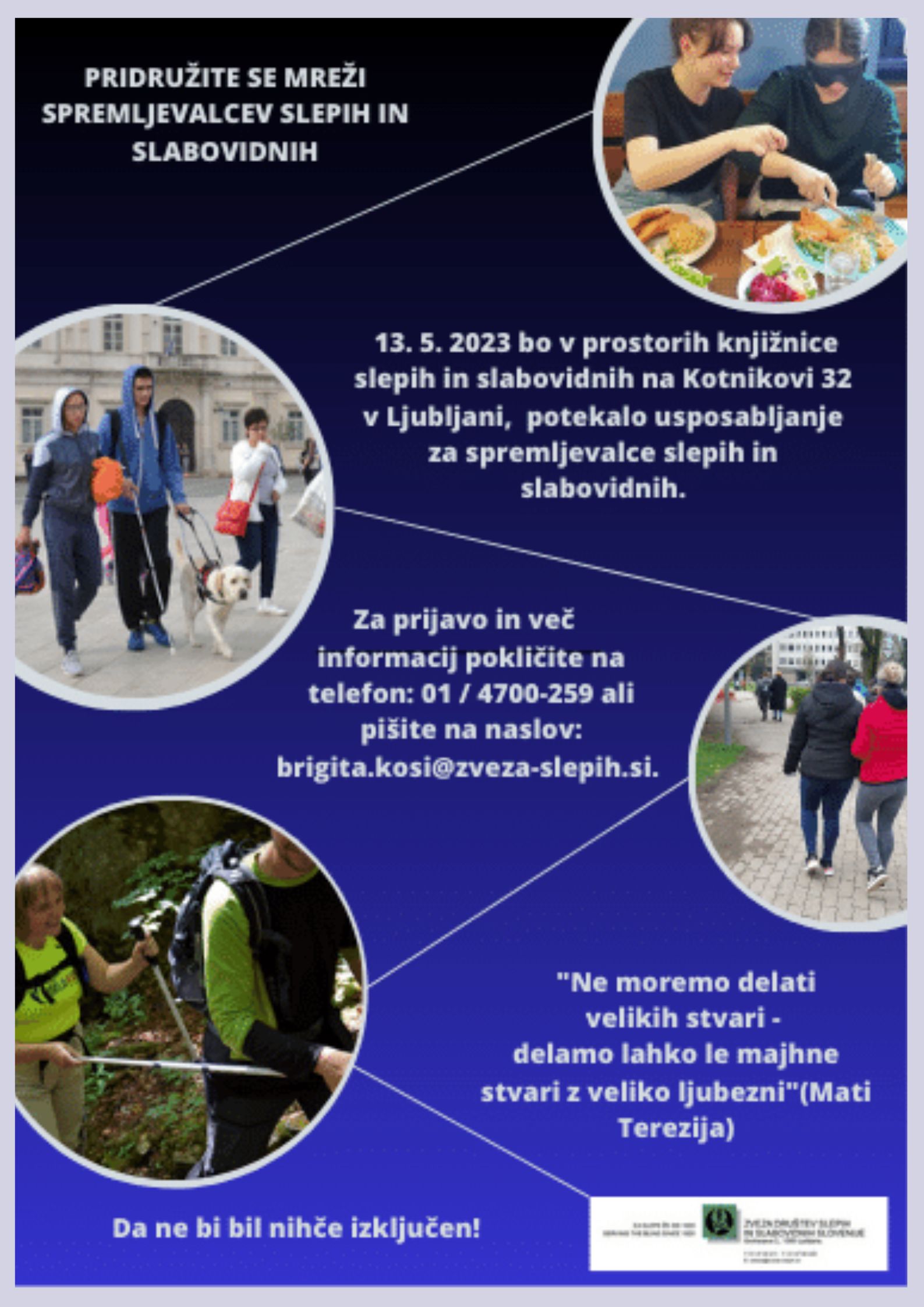 Program osebam s slepoto in slabovidnostjo omogoča, da dobijo spremstvo, ko ga potrebujejo, in jih podpira v prizadevanjih za čim večjo samostojnost in vključenost v družbo. Če ste tudi vi pripravljeni kakšno uro svojega časa nameniti spremljanju, vas vabijo, da se pridružite Mreži spremljevalk_cev. Brezplačno usposabljanje za spremljevalce_ke slepih in slabovidnih bo potekalo v soboto, 13. 5. 2023, v Ljubljani.